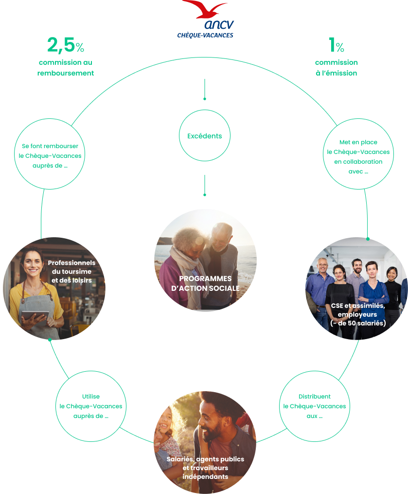 Depuis plus de 40 ans, nous sommes fiers d’avoir construit un cercle vertueux à dimension sociale et solidaire.Plus de 4,76 millions de bénéficiaires – salariés, agents publics et travailleurs indépendants – profitent des Chèques-Vacances et les utilisent chez plus de 128 600 professionnels du tourisme et des loisirs au quotidien.Il s’agit du réseau le plus large de l’hexagone !Les excédents de gestion générés sont simplement réinjectés pour financer des programmes d’action sociale. Parce que proximité et solidarité vont souvent de pair !